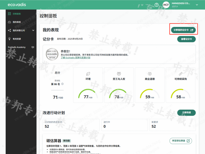 恭贺杭州XX过滤器材有限公司2025年9月EcoVadis取得71分的优秀成绩